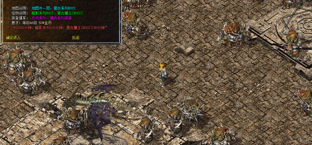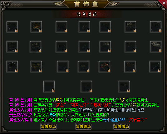 装备介绍:商店货→沃玛→祖玛→赤月套→复古战狂→所有装备暴率都很低,绝不会烂安全区的存在长期养老!